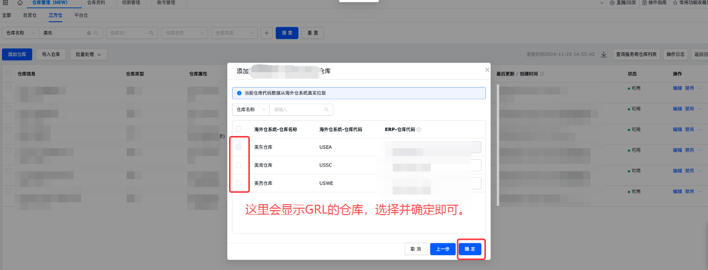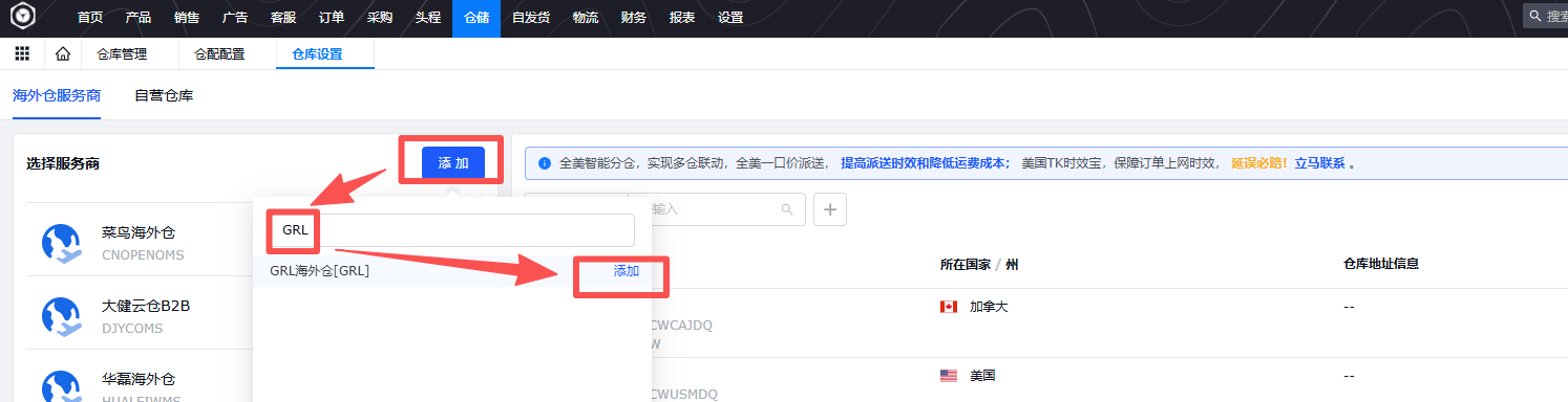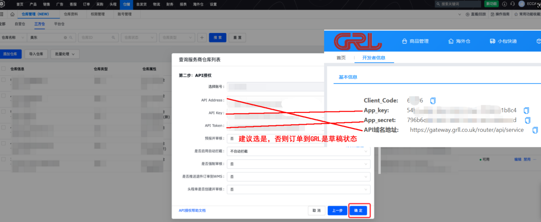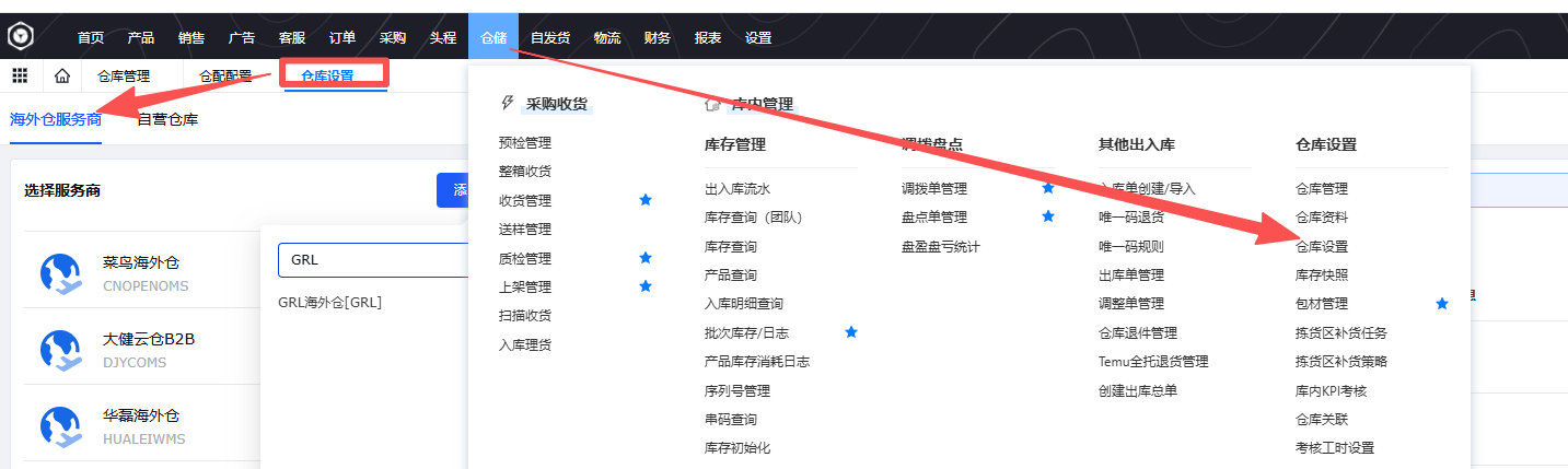 GRL仓储管理系统已经和易仓ERP对接了海外仓一件代发业务。易仓ERP的具体配置如下: ## 系统对接授权 ### 添加海外仓服务商 路径:仓储》仓库设置》海外仓服务商;  点击“添加”按钮,搜索“GRL”可找到GRL海外仓,添加之后就可在左边的服务商列表中看到“GRL海外仓”。  ### 增加仓库和授权 **Step1:点击「查询服务商仓库列表」** 仓储》仓库管理页面,三方仓页签下点击“新增”,输入“GRL”可查到GRL海外仓,勾选海外仓,点击「下一步」。  **Step2:填写三方海外仓的授权信息** 海外仓授权可在OMS申请并查看,具体请参考《[开发者信息](https://help.wlwytech.com/project-8/doc-234/ "开发者信息")》,授权信息映射关系请见下图。点击“确定”,易仓ERP会继续获取GRL的所有仓库。  **Step3:勾选具体的海外仓** GRL有多个仓库,选择您需要使用的海外,勾选后,点击「确定」即可。  以上信息可在易仓ERP的操作指导中找到,具体请见《[易仓ERP仓库管理](https://home.eccang.com/#/company/helper/center?docId=111938 "易仓ERP仓库管理")》,此链接需要登录易仓ERP系统查看,用您的易仓账号登录即可正常浏览。